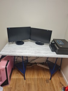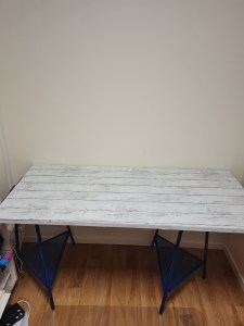 Fick en bordskiva av en vän, för att jag skulle göra ett datorbord så jag kunde flytta in i min lilla vrå… Fick kapa bordet (har ingen bild på hur stort de var innan)