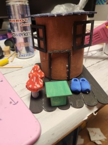 För att göra detta hus har jag tagit etikettrulle och målat den medhobbyfärg. Sen tog jag glasspinnar i större format oh malde dem och sen hade jag från ett gammalt projekt från ett miniatyrhus borden, svamparna och skorna. Taket är gjort av små glasspinnar, även skorstenen.